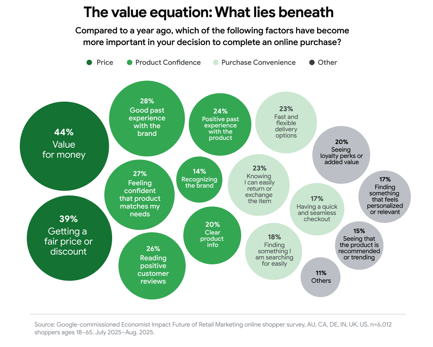 This year, value is the lens many consumers are using to make decisions. Research shows that half of U.S. holiday shoppers conduct the same amount of prepurchase research for Black Friday as the rest of the year, while 38% do even more. And when asked what matters most, 44% said value for money has become the #1 factor influencing their purchase decisions.